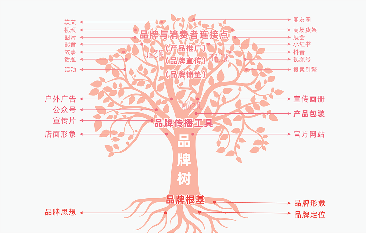 从品牌树的结构中,我们可以看到产品包装只属于其中的枝干部分,想让品牌枝干得到更好的成长,从而连接、生长出茂盛枝叶,带动品牌这棵大树成长。