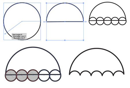 我们的下一个图标是一把伞。使用椭圆工具绘制圆。使用选择工具调整圆的半径角度,使您有一个半圆(这是CC 2015功能)。沿着大半圆的边缘排列五个小圆圈。使用“形状构建器工具”将它们组合在一起,并从大圆圈中删除相交的部分。