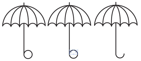 对于伞形把手中的曲线,在您之前绘制的垂直线的底部边缘排成一个小圆圈。使用剪刀工具,切割圆圈的顶部两个部分并删除它们。集团一切融合在一起。