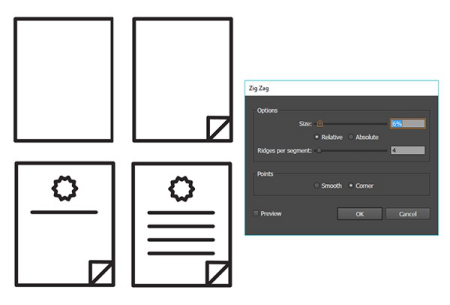 文档图标非常简单。使用矩形工具绘制一个矩形。在底角添加一个小三角形。您可以使用钢笔工具或多边形工具绘制它。对于印章,绘制一个小圆圈并使用Zig Zag效果(效果>扭曲和变形> Zig Zag并根据需要调整设置。在文档本身上添加几个线段用于书写。