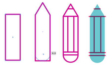 让我们创建一个彩色铅笔图标?;桓鼍匦巍T诙ゲ勘咴堤砑右桓雒?,然后使用直接选择工具将其向上拉。通过向内拉动角,将矩形的底部四舍五入。添加垂直和水平线段以创建铅笔的详细信息和部分。