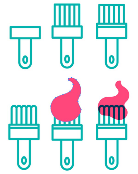 为刷子的刷毛画出五个相同的矩形。将它们排成一行,使它们重叠得足以形成一个大的正方形。圆形这些矩形的顶部边缘。使用您选择的绘图工具(我选择了铅笔工具),为油漆绘制一个颜色鲜艳的大型形状。将其混合模式设置为乘法。