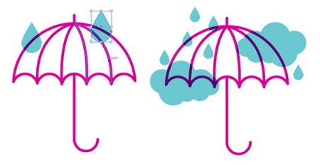 对于您已创建的图标,让我们添加有趣的色彩!雨滴是简单的圆圈,其顶部锚点向上拉。云由多个重叠并联合在一起的圆形成。确保填充颜色设置为“正片叠底”,并且您的颜色选择可以很好地协同工作?;ゲ股蚶嗨粕释ǔJ遣淮淼难≡?。