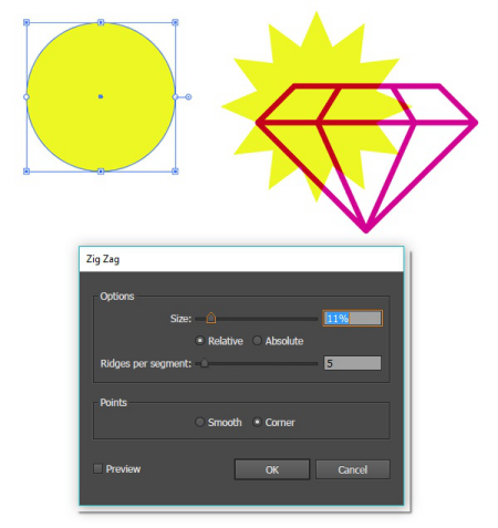 对于闪亮的钻石,画一个圆圈并在你的圆圈上应用Zig Zag效果。我选择每段5个脊,大小为11%。根据您的需要试验您的效果!