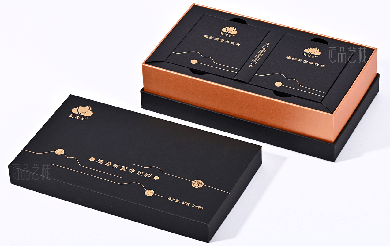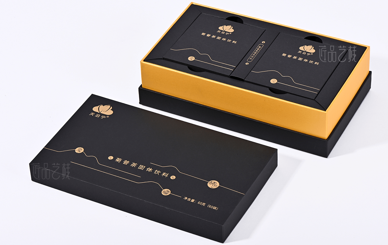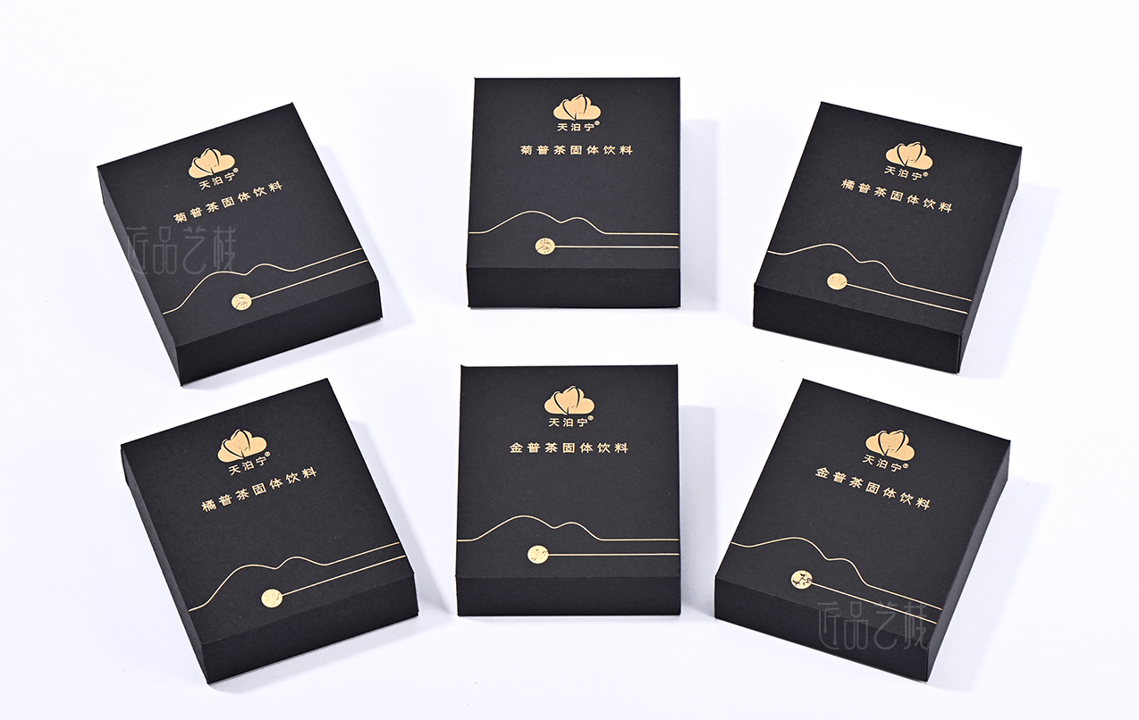 天泊宁茯苓普洱茶粉固体饮料品牌,选用云南高海拔优质大叶种普洱茶、上等优质茯苓为原料,经现代生物技术加工而成。在其系列产品包装盒设计印刷中,匠品艺栈采用普洱茶的黑色为统一主色,并根据不同产品分类采用不同颜色腰条为区分,使其整个系列产品包装盒,既能形成统一的品牌视觉形象,同时又区分出鲜明的产品特色。