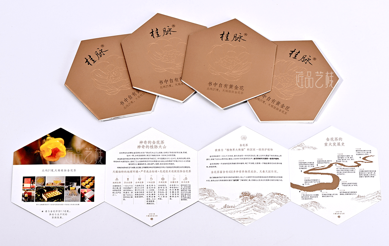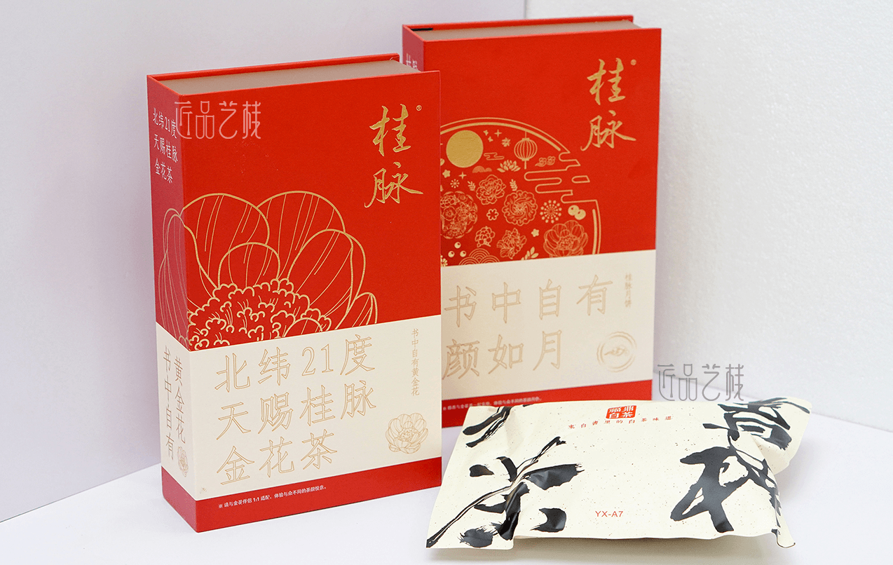 桂脉金花茶,广西金花茶领导品牌。金花茶是上古时代遗留下来的原始山茶遗珍,在桂脉品牌金花茶设计定制中,佳润隆包装&匠品艺栈采用传统书籍的创意形式,结合现代的印刷工艺和简约风格,搭配质感纸质和内托精制而成;使整理礼盒呈现出中国韵味文化,同时又不失送礼时的低调轻奢品质,打开包装,金花灿灿,寓意贵气人脉来,送礼倍有面。