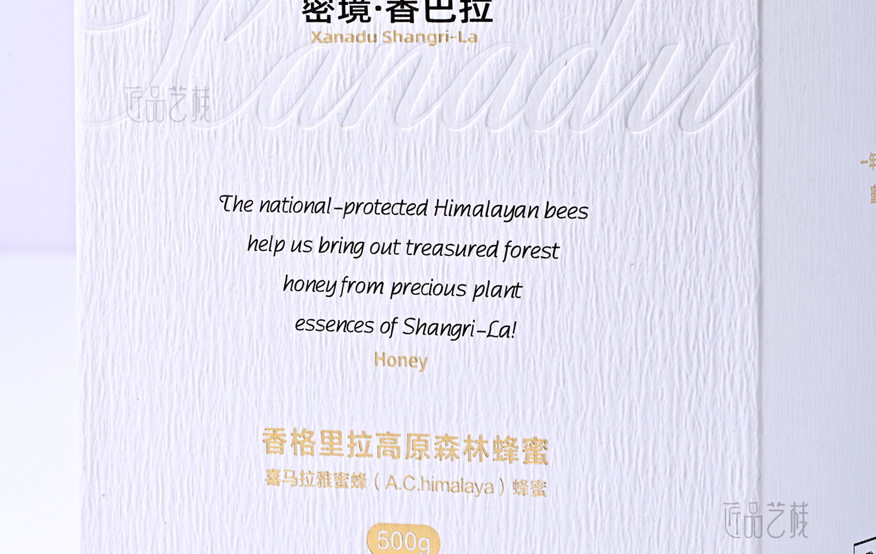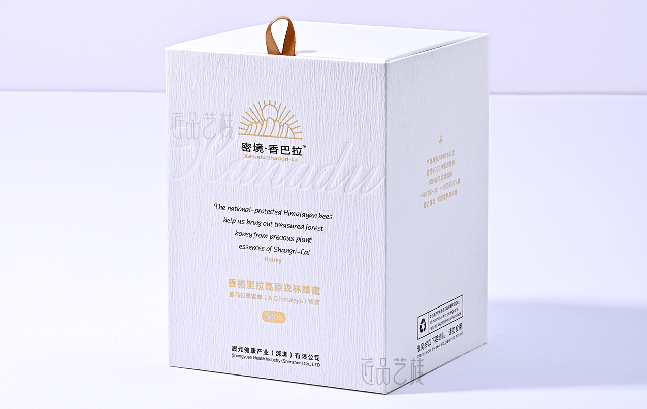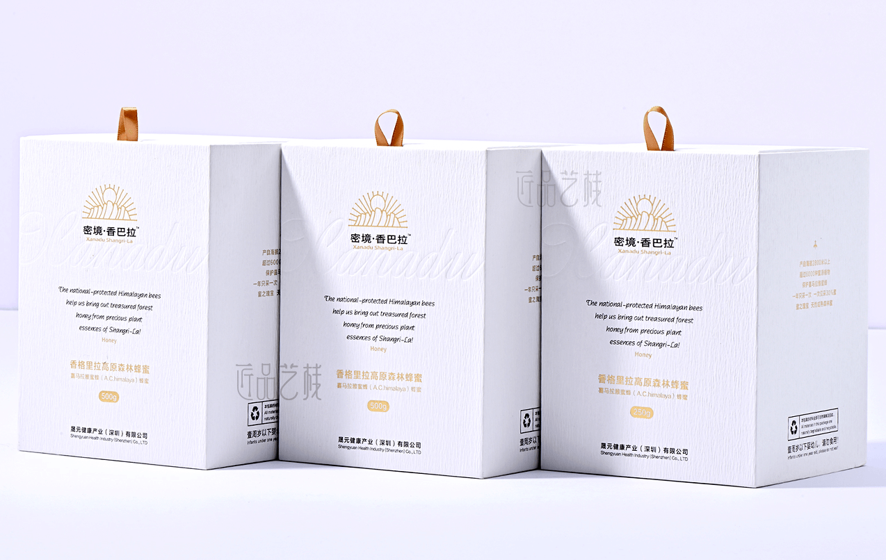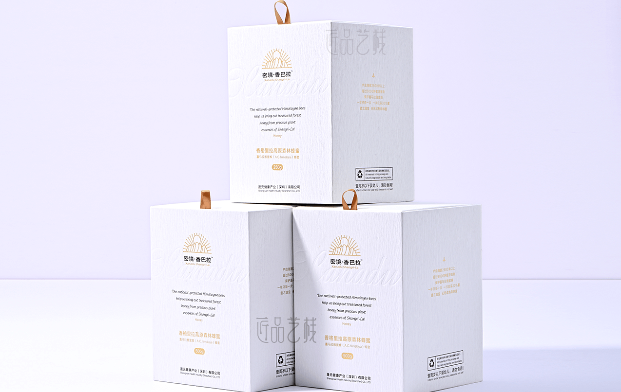 香巴拉品牌蜂蜜,甄选海拔3600米以上的香格里拉深林天然蜂蜜,在其包装盒定做中,采中纯白为底色,衬托其天然、纯净的蜂蜜品质;同时点辍烫金等印刷工艺,使该品牌包装盒呈现出简而不凡的气质,大力提升香巴拉品牌蜂蜜的市场溢价能力和消费者体验。