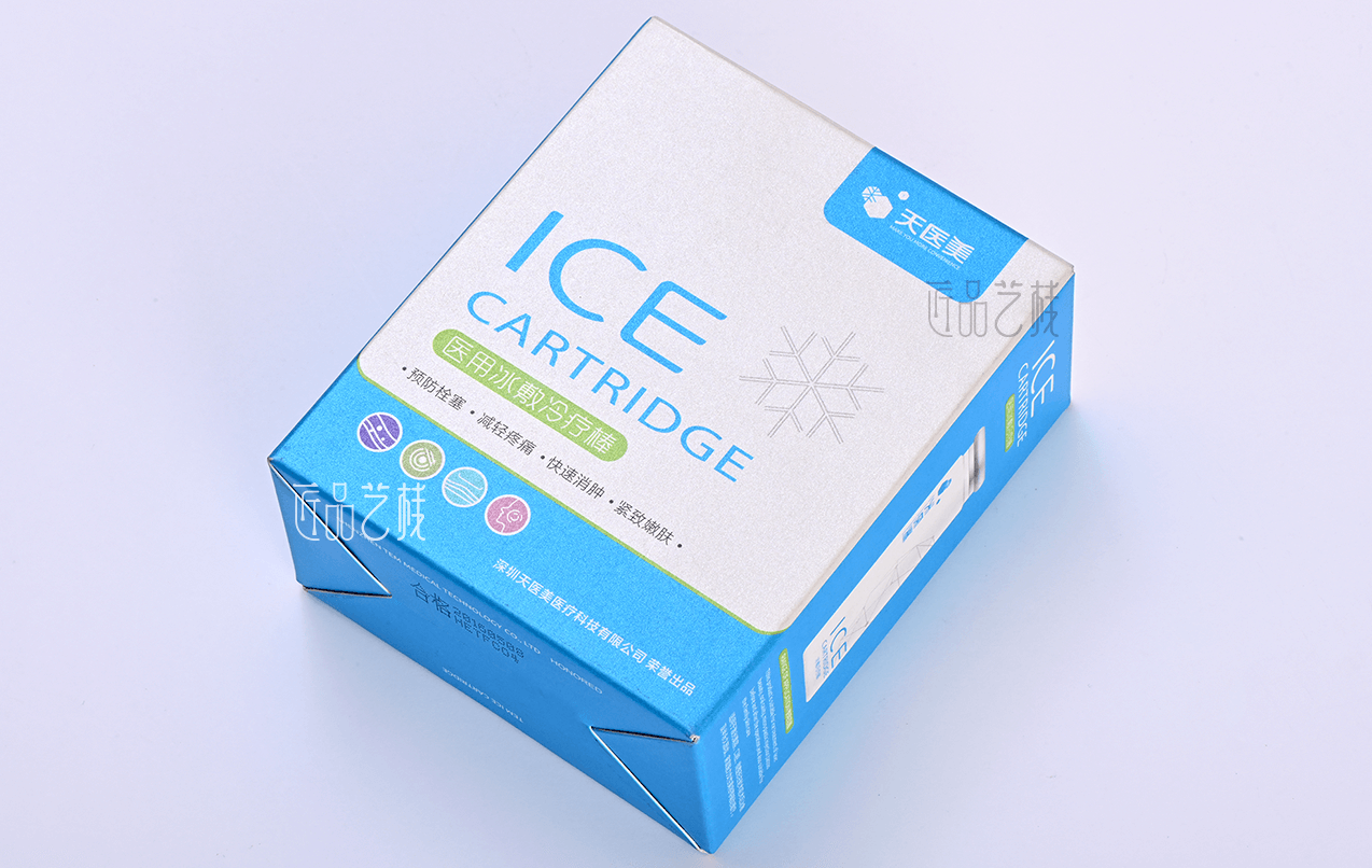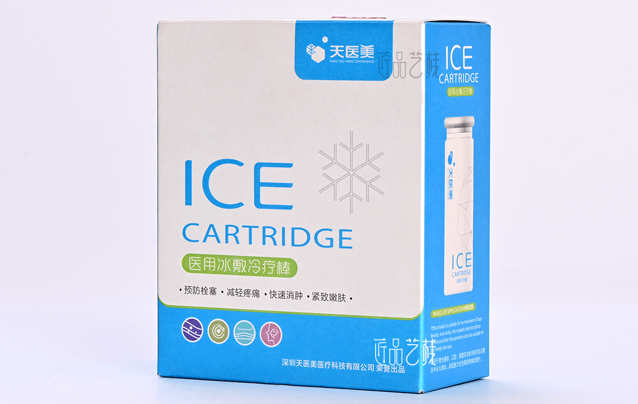 天医美医疗品牌,隶属于深圳天医美医疗科技有限公司,主营医疗器械、医疗设备等技术研发与销售。在天医美品牌医用冰敷冷疗棒产品包装盒印刷定制中,佳润隆包装印刷&匠品艺栈采用品牌冰面珠光纸,UV油墨和UV印刷烘干方式,使其产品包装盒更贴切于产品冰敷冷疗的气质,以及给人们带来健康和美肤的品牌寓意。