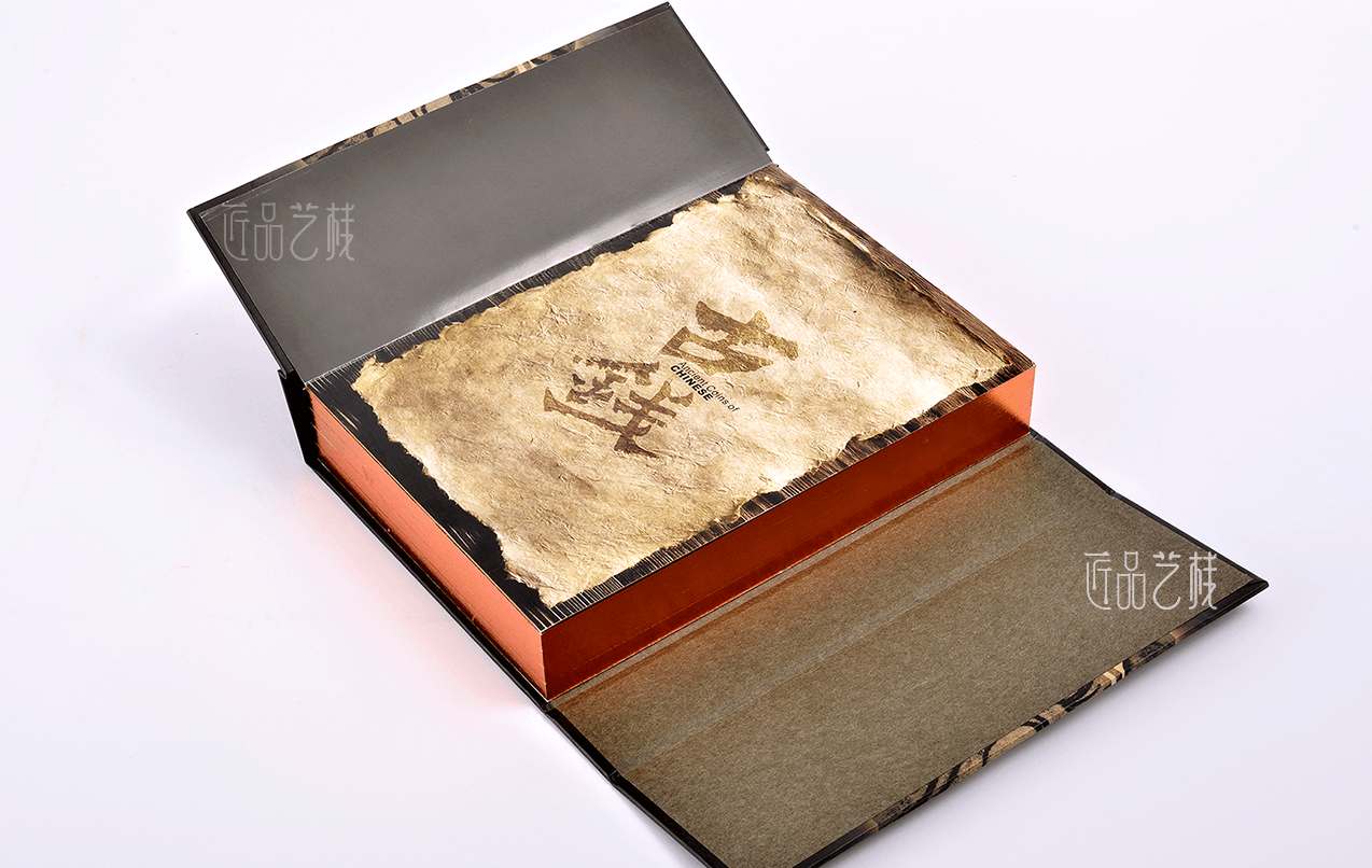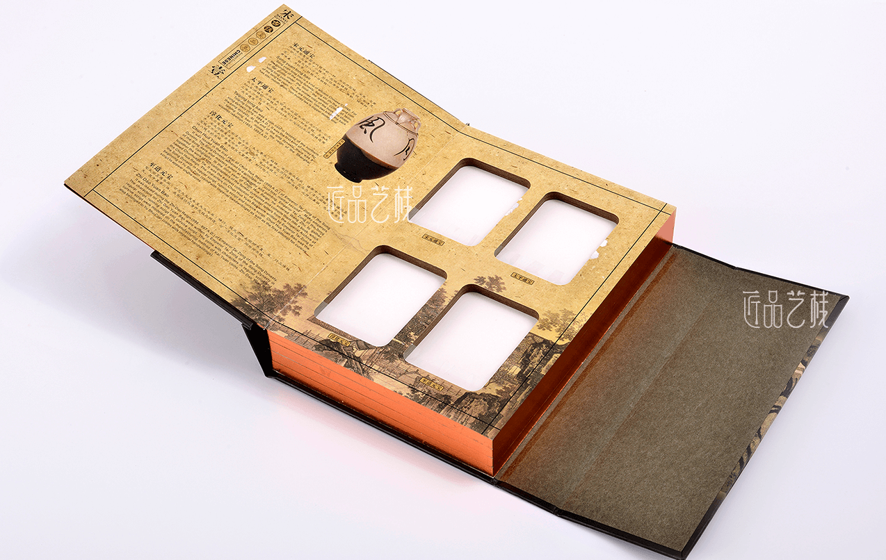 古钱真品集包装盒套装定制,是一款专为古钱币收藏而定制的包装盒,采用蝴蝶活页精装的创意结构,以中国古典元素结合双开门的形式,以及金边烫印等工艺,使整个包装盒呈现出古典、奢华和浓浓的历史感,体现出所收藏古币的高端品质感和文化价值。