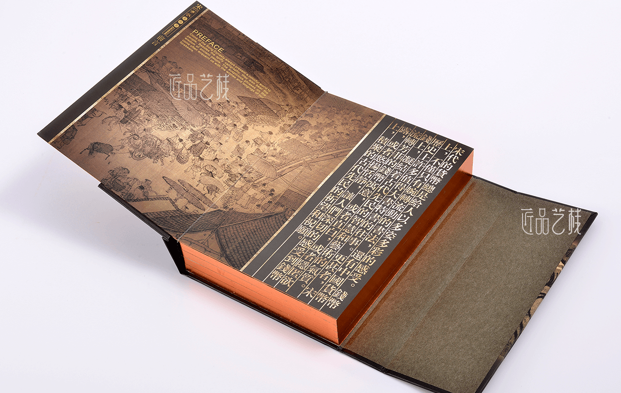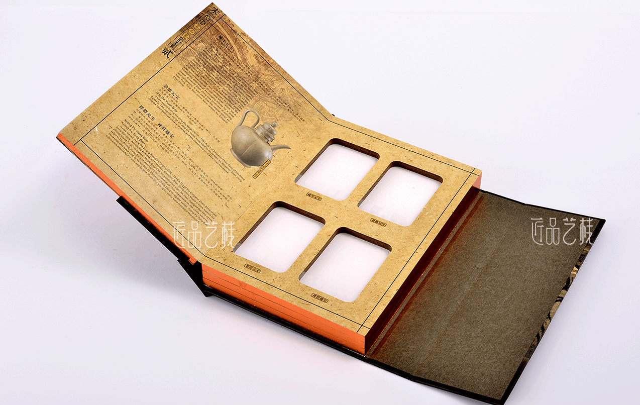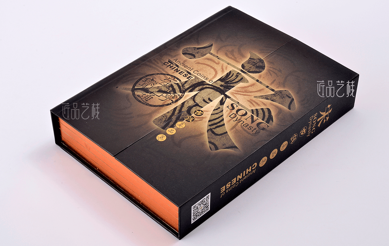 古钱真品集文创包装盒,是一款专为古钱币收藏而定制的包装盒,采用蝴蝶活页精装的创意结构,以中国古典元素结合双开门的形式,以及金边烫印等工艺,使整个包装盒呈现出古典、奢华和浓浓历史感的高端品质风格。