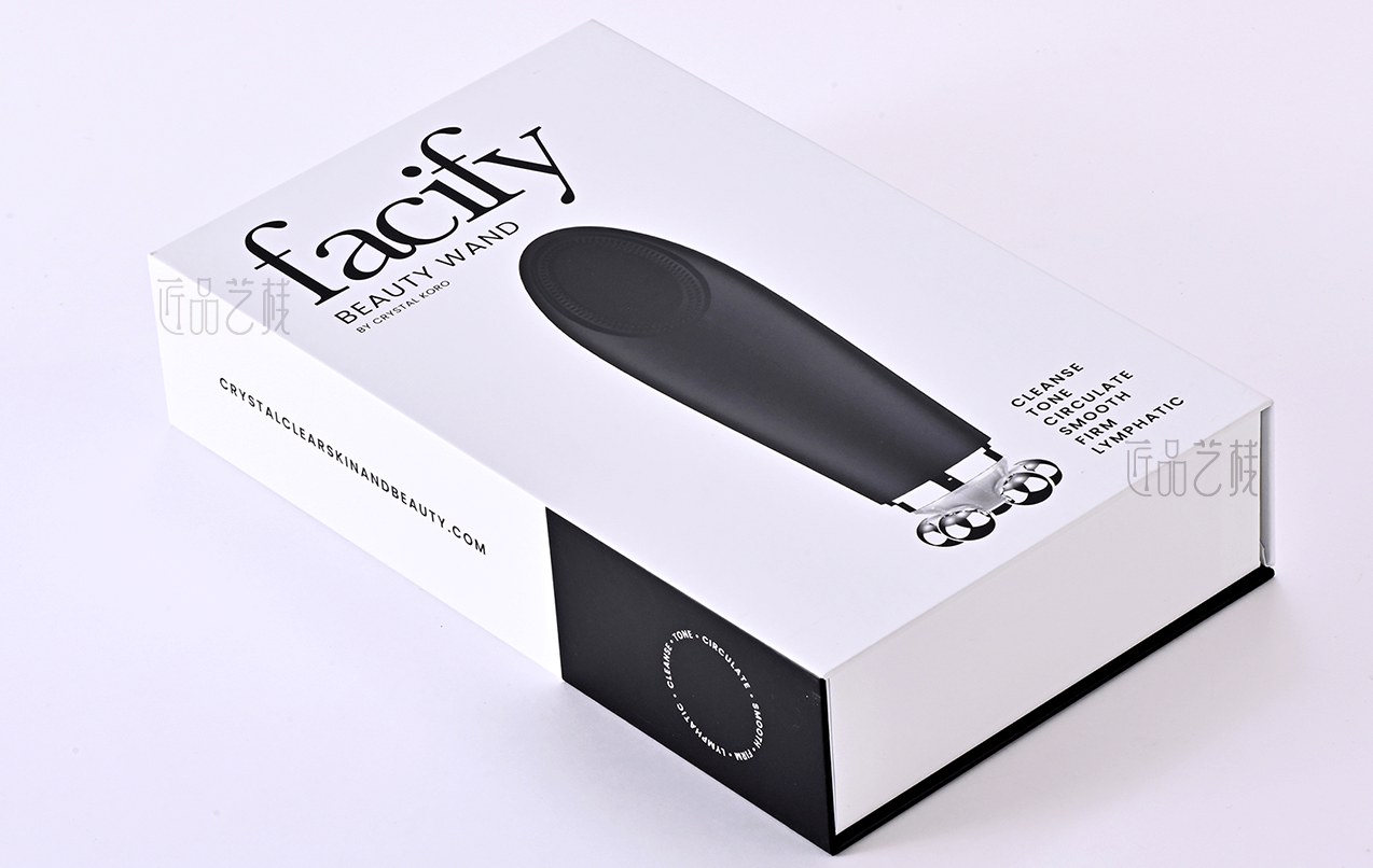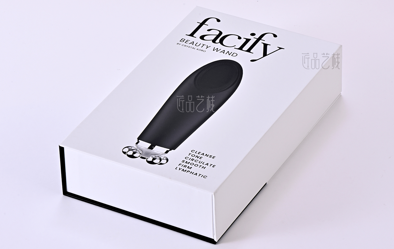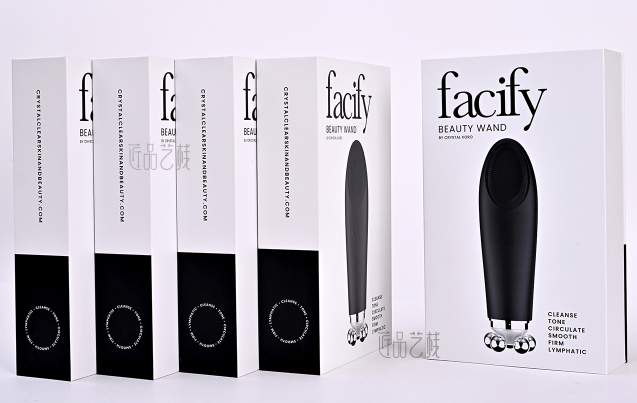 facify是一立足于欧美市场的知名医美品牌,旗下自设数十家美容连锁机构,在与其按摩棒包装盒印刷定制中,佳润隆包装印刷&匠品艺栈采用展开式书型盒结构,以及高端品质的吸塑内托,搭配其简约、大气的欧美风格,使其达到既简便使用,又能传播品牌理念和为传产品溢价的品质成效。