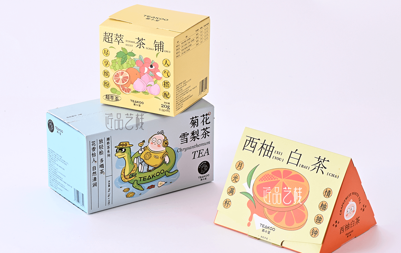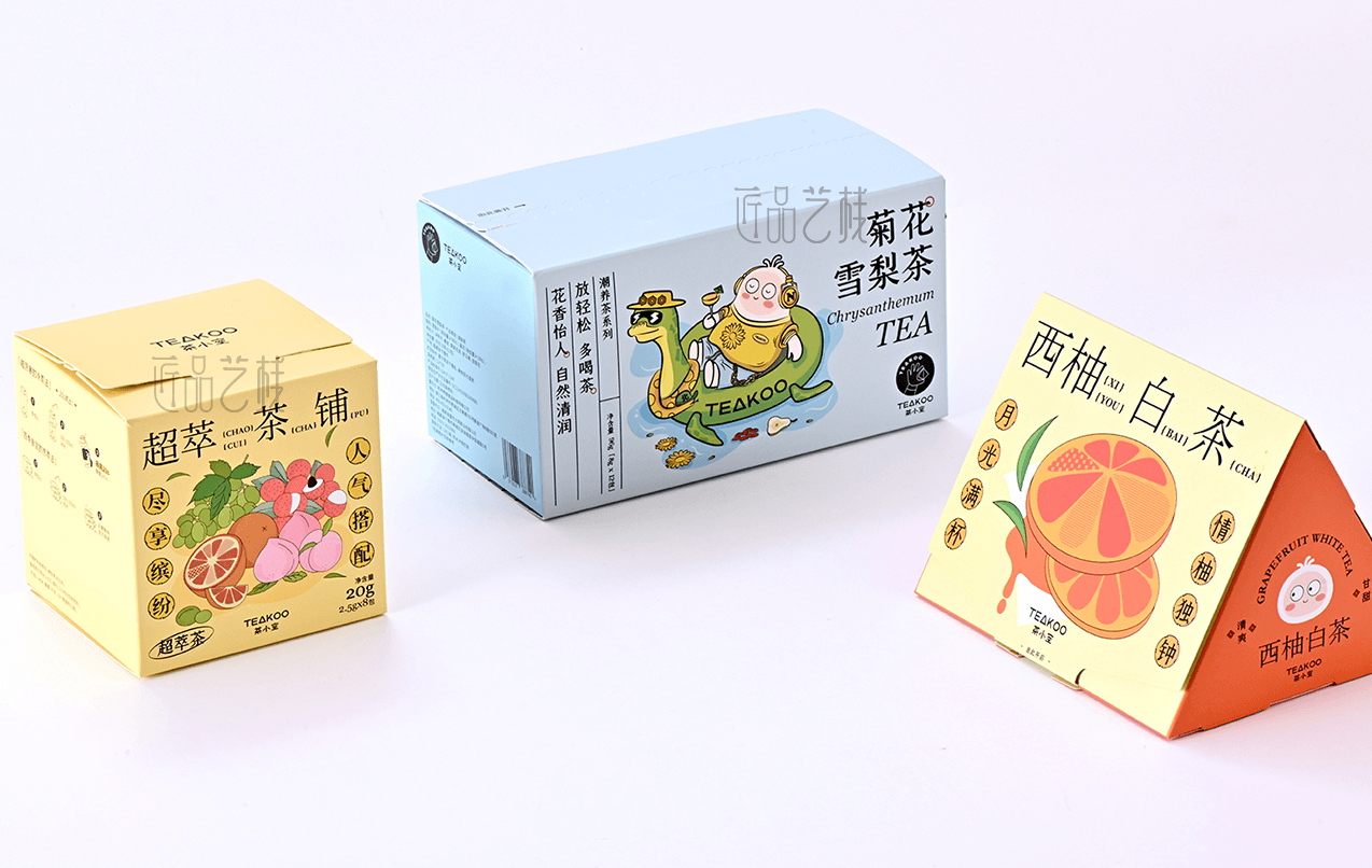 茶,是我国的传统饮品。茶小宝通过不断创新技术与互联网支撑全茶产业链整体转型升级发展,创新创造新颖的健康茶叶品牌企业。在其产品包装盒定制中,亦采用新颖的纸盒结构,运用优质的品牌纸张和进口海德堡印刷机印刷,自动粘盒机和工艺精制,打造新潮、时尚的卡纸包装盒系列茶叶品牌。