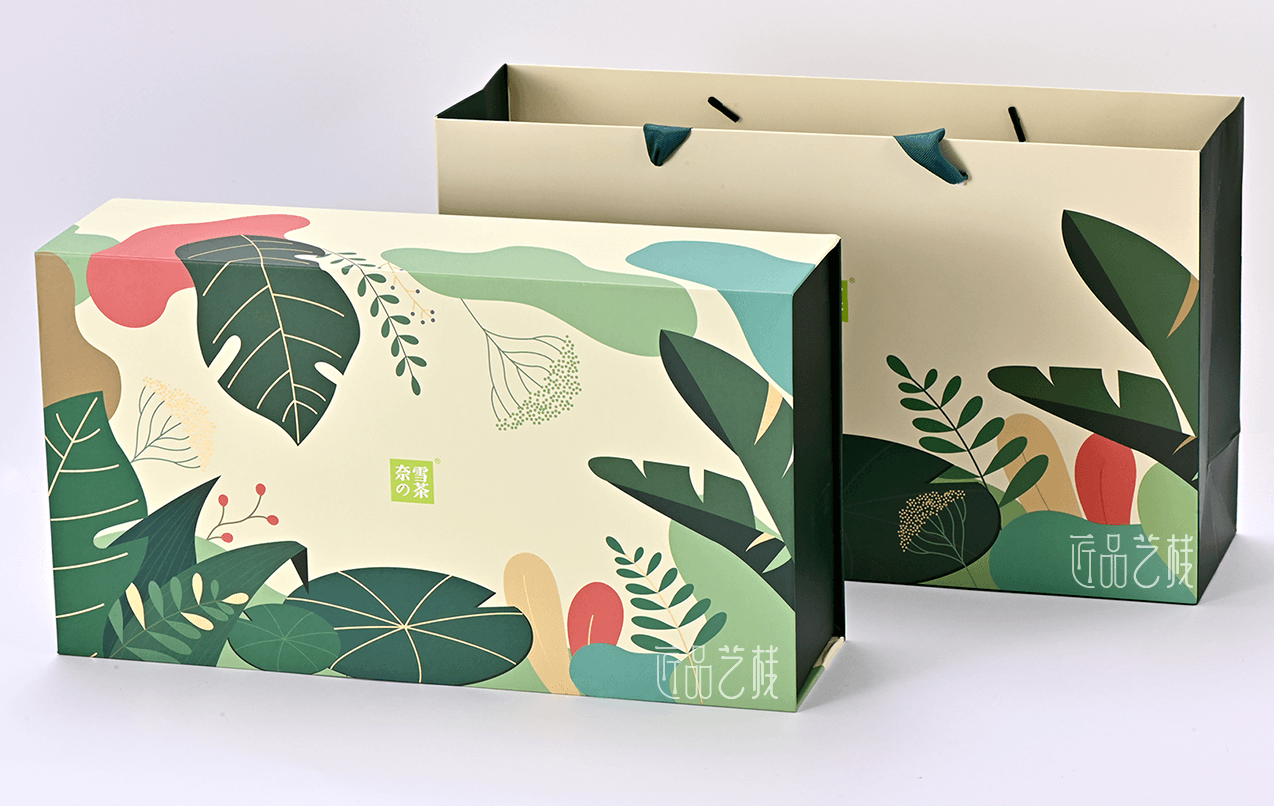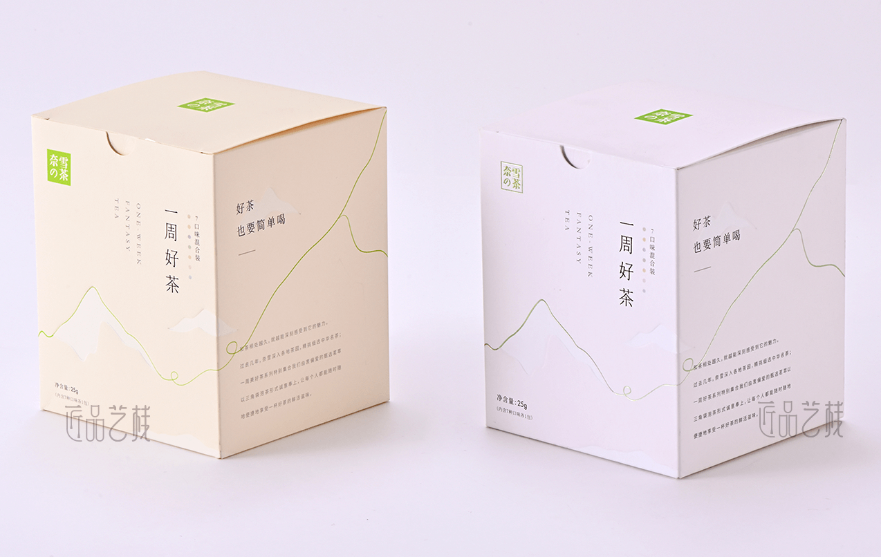 一周好茶,是奈雪的茶特别选择了深受年轻消费者喜爱的花茶品类,以杯杯专属新意不重样的理念,带来更加专注且丰富的产品升级,在其产品包装纸盒的订做上,亦采用简约新潮的创新纸张,配合简约的印刷色彩、烫金和凸印工艺,使其呈现出现代简约、深受年轻消费者喜爱的包装风格。